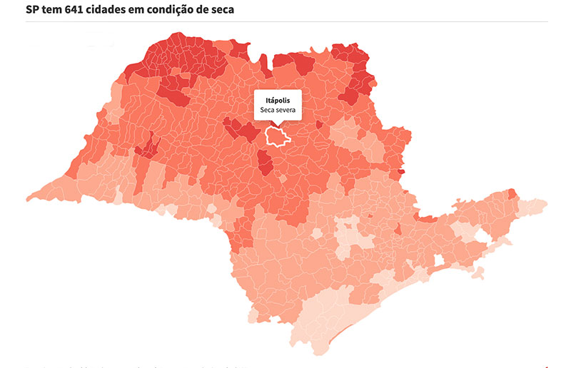 O interior de São Paulo enfrenta um intenso período de estiagem, com condições de seca extrema e severa em mais da metade do estado de São Paulo, incluindo Itápolis. Nas regiões de Sorocaba, Jundiaí, Itapetininga, Bauru e São José do Rio Preto (SP), a situação não é diferente, mostram dados do Governo Federal (veja mapa acima).