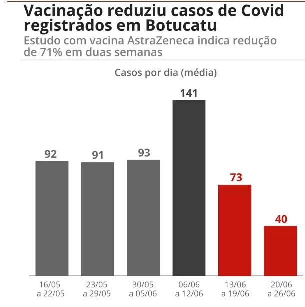 Botucatu registrou mais uma queda na média diária de novos casos de Covid-19 quase dois meses após as ações de vacinação em massa. A cidade faz parte da pesquisa sobre a efetividade da vacina Oxford/AstraZeneca. No acumulado das oito semanas, a redução dos casos chegou a 86,5%.