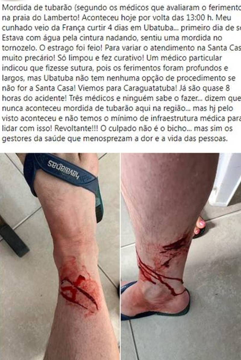 No último dia 3, um turista francês de 39 anos foi mordido por um tubarão quando nadava na Praia do Lamberto, em Ubatuba, litoral norte de São Paulo. O banhista sofreu cortes profundos na perna e precisou de atendimento hospitalar - confira foto abaixo.