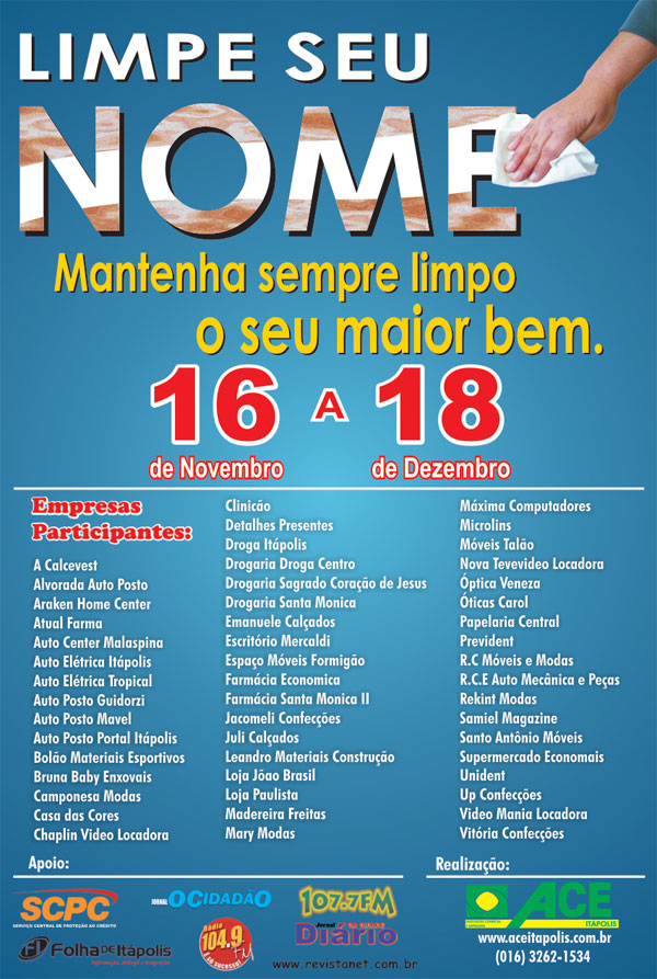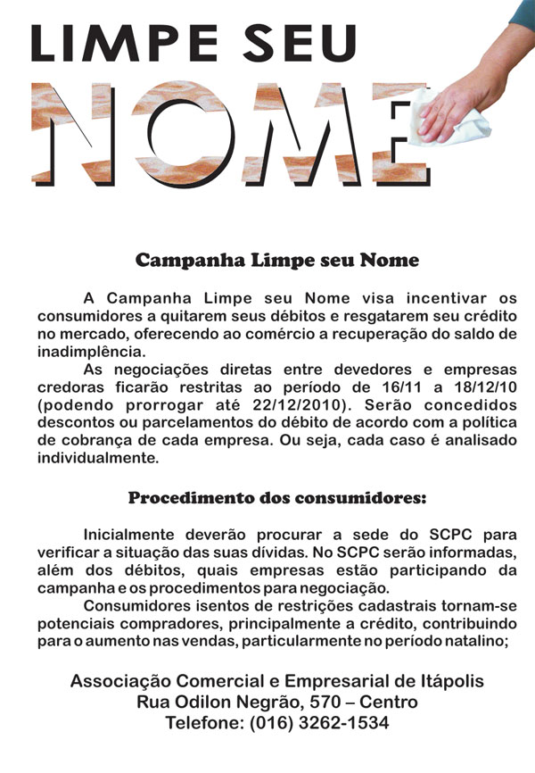 Acaba de ter início e vai até o dia 18/12 a campanha LIMPE SEU NOME da Associação Comercial e Empresarial de Itápolis. A campanha tem como objetivo promover a negociação entre empresas e consumidores com o objetivo de reabilitar o crédito de quem tem o nome negativado.
