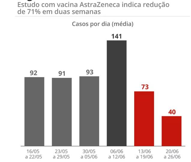 Pesquisadores que acompanham o estudo de efetividade da vacina veem essa queda pela segunda semana consecutiva já como reflexo da primeira dose da Oxford/AstraZeneca, mas o acompanhamento dos números pode reforçar essa relação. O uso de máscara e distanciamento devem continuar sendo respeitados. A segunda dose está prevista para agosto.
