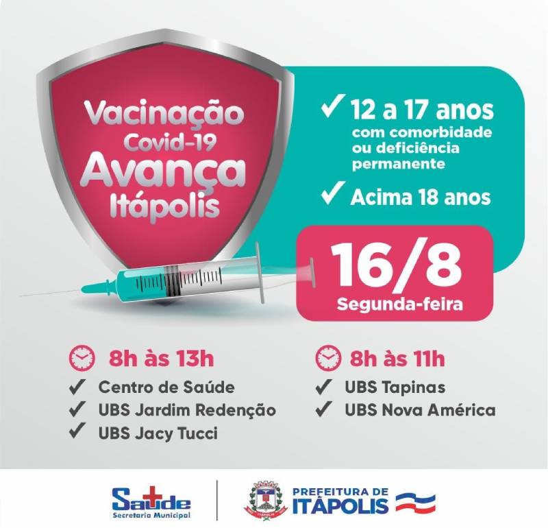 A Prefeitura de Itápolis e Secretaria de Saúde avançam, mais uma vez, com o cronograma de Vacinação Covid-19. A partir de Segunda-feira (16/08), seguindo até Sexta-feira (20/08)