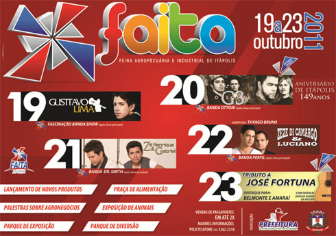 A Feira começa dia 19 de outubro. DIA 19 - GUSTAVO LIMA, DIA 20 - OFICINA G3, DIA 21 - ZÉ HENRIQUE E GABRIEL , DIA 22 - ZEZÉ DI CAMARGO E LUCIANO, DIA 23 - TRIBUTO A JOSÉ FORTUNA DESTAQUE PARA BELMONTE E AMARAÍ e Bandas Raízes da Região. Os passaportes já estão à venda.