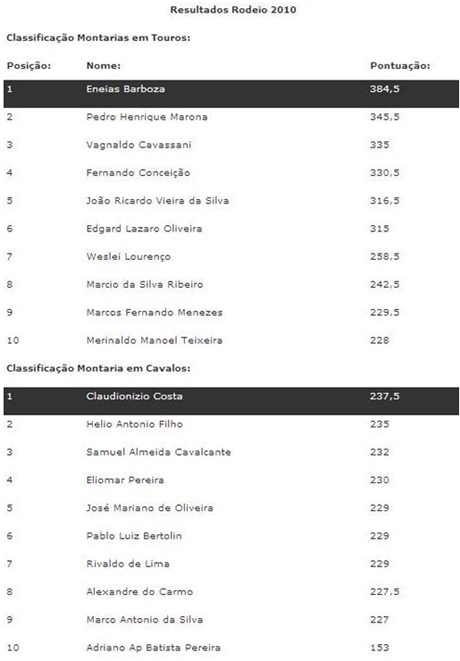 O Rodeio na Noite de Quinta Feira dia 09 de Setembro, contou com 60 Competidores no Rodeio em Touros em 1 Turma e 42 no Rodeio em Cavalos.
