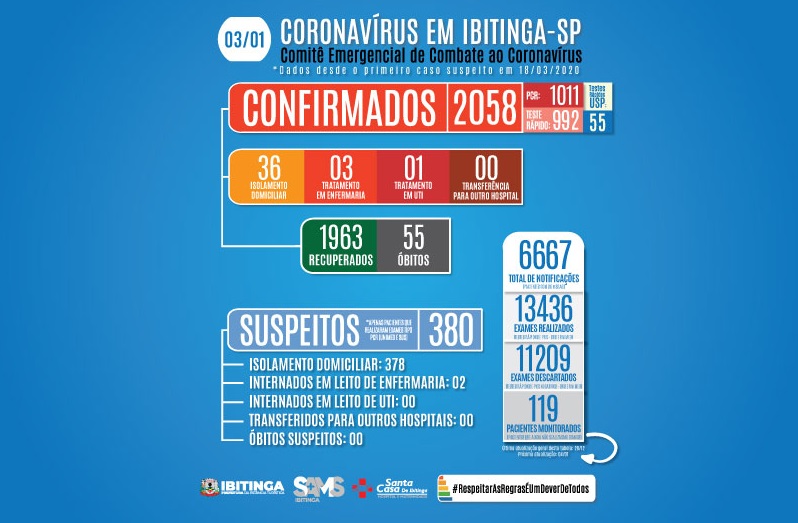 Da Assessoria da Prefeitura - Boletim 10/01/2021. Primeiramente queremos reforçar o alerta da Secretaria de Saúde e Santa Casa sobre a ocupação dos leitos do hospital que atendem os pacientes de COVID-19 e de todos os outros diagnósticos médicos que encontram-se lotado. Respeite às medidas de prevenção para evitarmos a continuidade da transmissão do novo coronavírus.