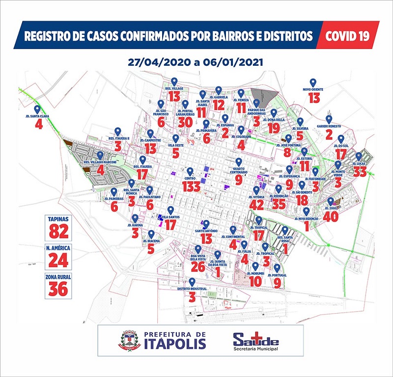 A Secretaria de Saúde de Itápolis, por meio da Vigilância Epidemiológica, informa que, nesta quinta-feira (07/01), foram confirmados mais 16 novos casos de COVID-19. No total, são 843 casos confirmados e 52 aguardando resultado do exame. A UTI está com 4 confirmados e um suspeito de COVID-19.