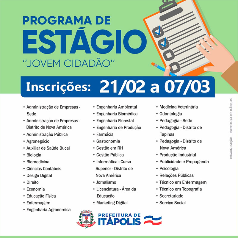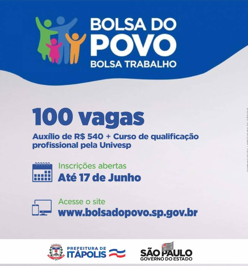 Oportunidade para quem está desempregado: Itápolis tem 100 vagas para o programa Bolsa Trabalho. O auxílio é de R$ 540 + curso de qualificação profissional. As inscrições poderam ser feitas até o dia 17/6 presenciais no Infocentro/PAT ou no Centro de Inclusão Digital de Tapinas, ou on-line pelo site: www.bolsadopovo.sp.gov.br