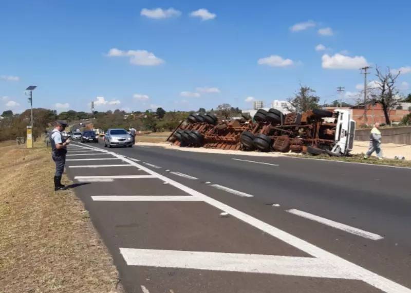 Um caminhão carregado com serragem tombou no quilômetro 232 da Rodovia Washington Luís (SP-310), na altura da entrada do bairro São Carlos 8, em São Carlos.