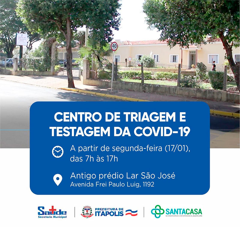 A partir desta segunda-feira (17), das 7h às 17h, as pessoas que estiverem com síndrome gripal poderão passar pelo Centro de Triagem e Testagem da Covid-19, que estará localizado no antigo prédio do Lar São José (Avenida Frei Paulo Luig, 1192).