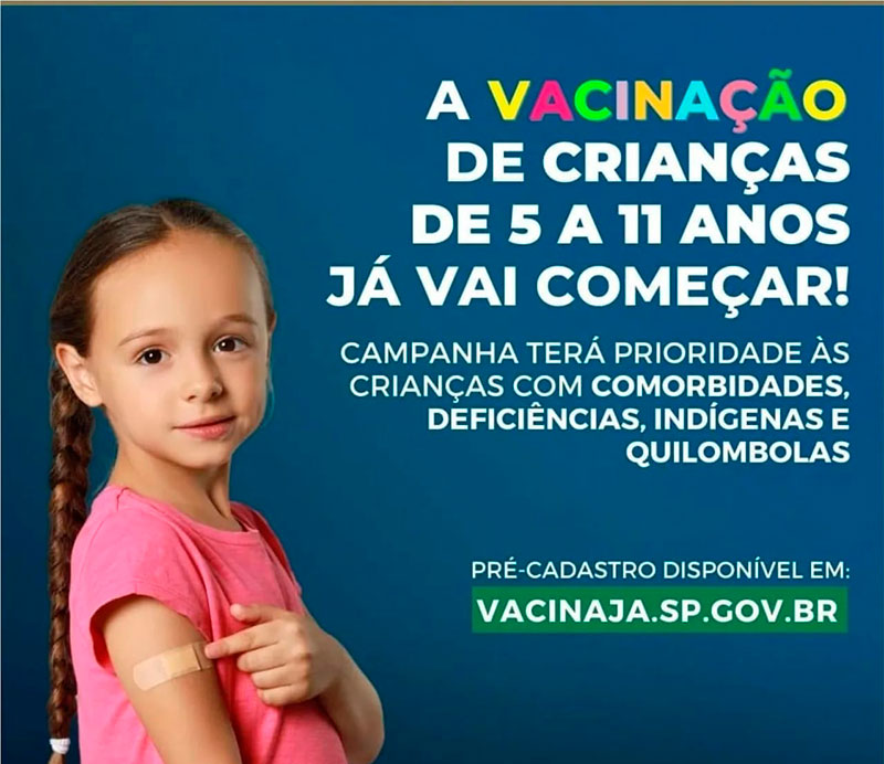 Vacinação de Crianças de 5 a 11 anos, com comorbidades ou deficiência permanente, começa segunda-feira (17) em Itápolis