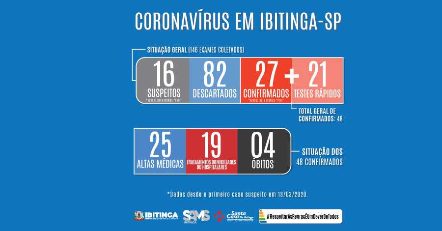 A Prefeitura de Ibitinga confirmou, neste domingo (7), mais uma morte por coronavírus na cidade. De acordo com a prefeitura, trata-se de uma paciente de 56 anos que estava internada na Santa Casa de Ibitinga. Ela possuía fatores de risco como diabetes e hipertensão arterial. Com isso, a cidade soma 45 casos confirmados de Covid-19, sendo quatro óbitos pela doença.