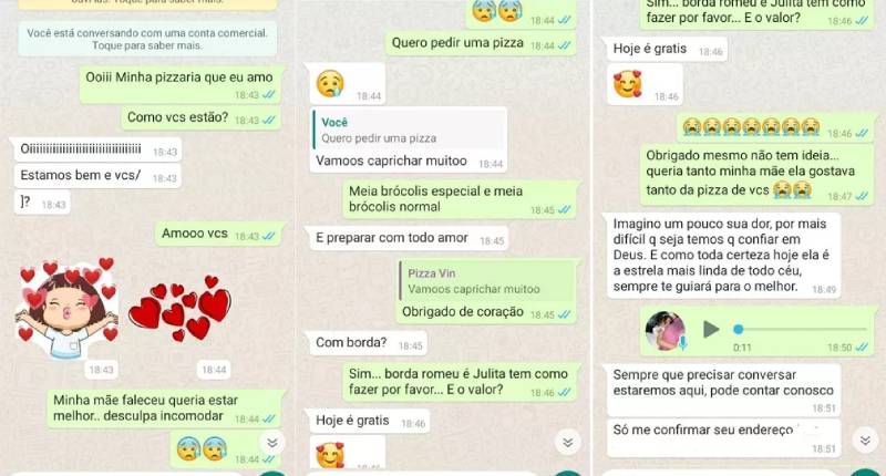 “Era só eu e minha mãe. Ela era e é ainda tudo na minha vida, foi um baque. Eu pedi pizza e eles são sempre atenciosos. Perguntam se está tudo bem e eu acabei respondendo que infelizmente não estava, que a minha mãe tinha falecido e recebi só palavras de conforto, ai comecei a chorar”, conta.