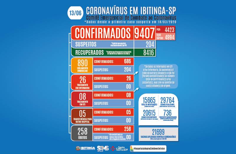 O total de casos confirmados ativos, atualmente, é 362: 350 em isolamento domiciliar, 05 internados na Enfermaria, 03 na UTI e 04 transferidos para Hospitais Terciários. Foram notificados 159 óbitos decorrentes do novo coronavírus.