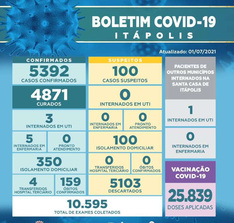 A Secretaria Municipal de Saúde, por meio da Vigilância Epidemiológica, informa o quadro geral da Covid-19 em Itápolis desta quinta-feira (01/07):