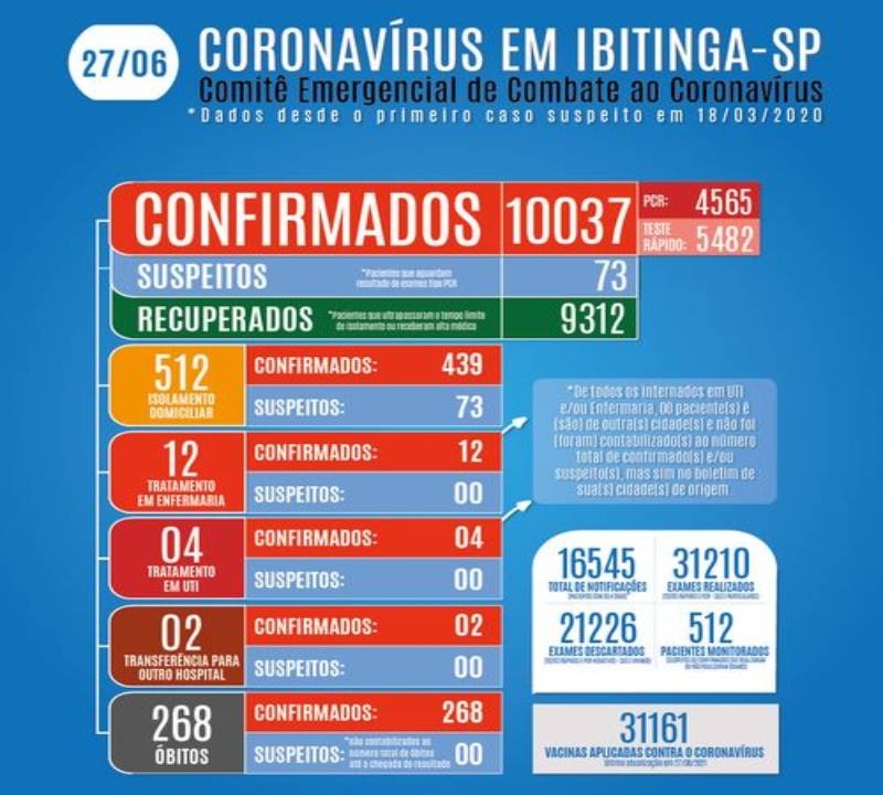 A Secretaria Municipal de Saúde, por meio da Vigilância Epidemiológica, informa o quadro geral da Covid-19 em Itápolis deste domingo (27/06):