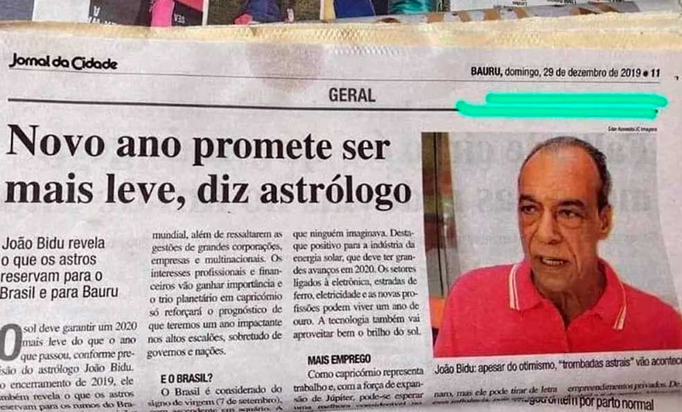 "Podemos esperar um ano mais leve do que 2019, não só para as pessoas, mas para o mundo em geral." A previsão que o famoso astrólogo João Bidu fez para um jornal de Bauru (SP) em dezembro de 2019 viralizou na internet nos últimos dias por motivos óbvios, diante de um ano que já é o pior em muitas décadas.
