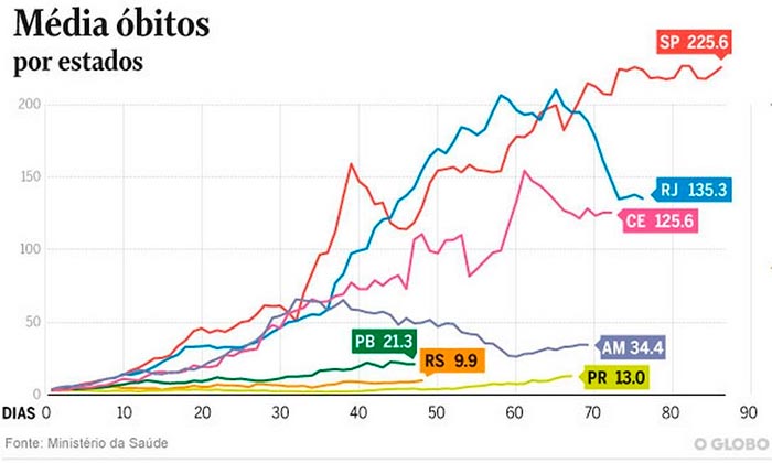 O estado do Rio chega até a insinuar uma queda um pouco mais clara no número de mortes por dia na última quinzena, passando de aproximadamente 200 para 140. São Paulo, no entanto, não conseguiu rebaixar este patamar da mesma forma.