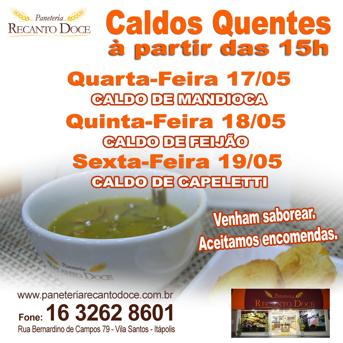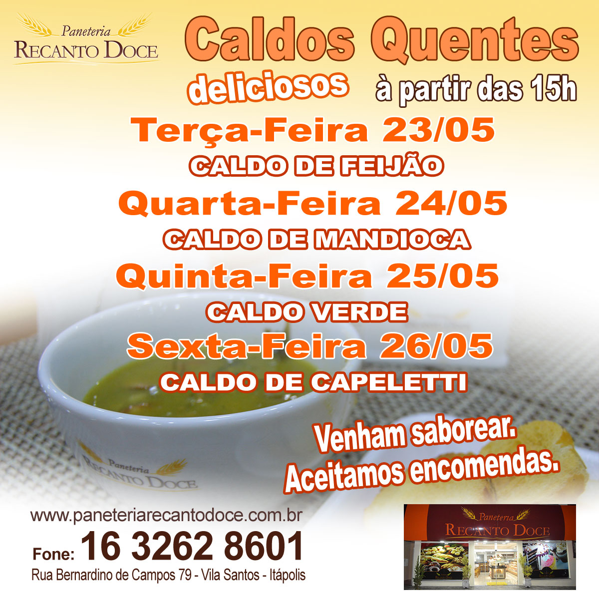 Informe - Caldos Quentes na Paneteria Recanto Doce .Venham Saborear