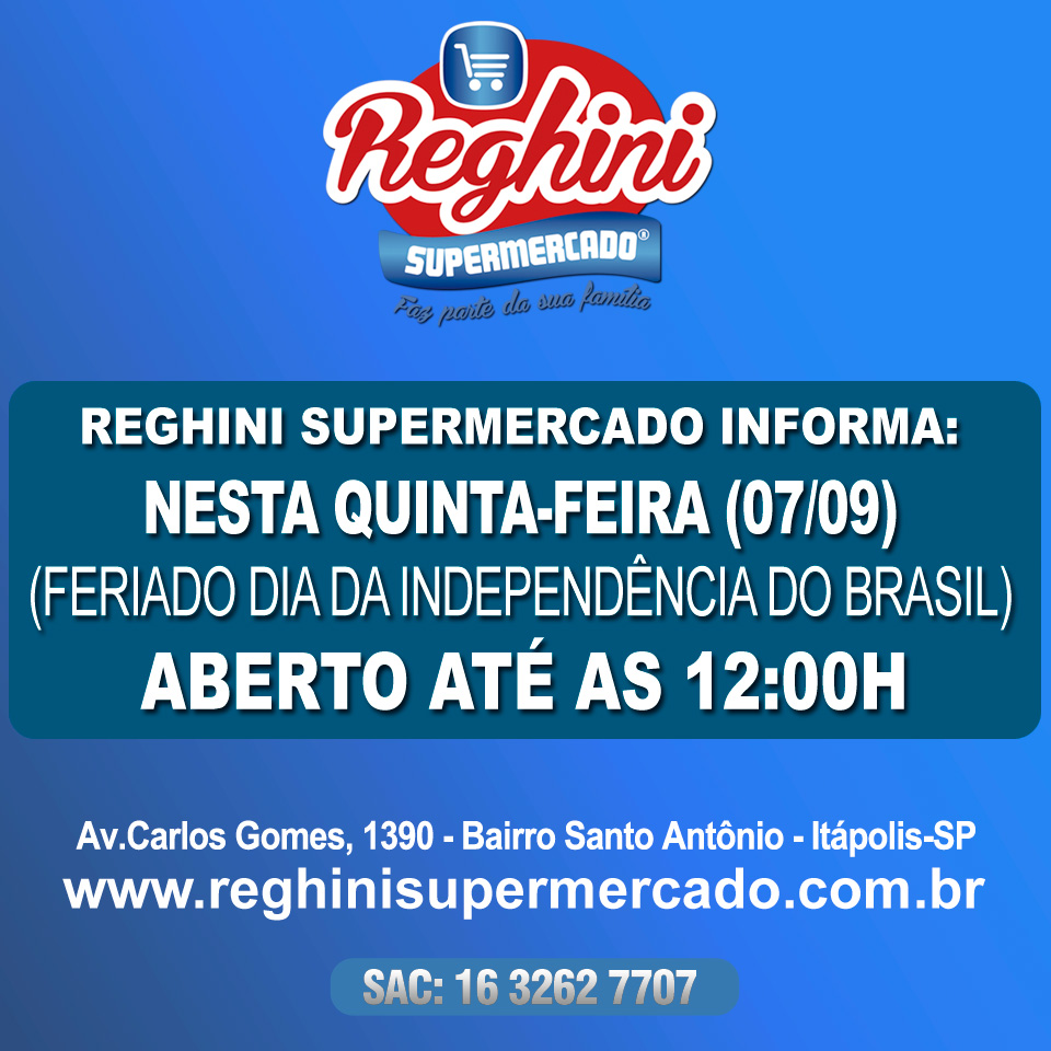 Informe: Reghini Supermercado aberto até ás 12:00h neste feriado de 7 de setembro.Confira ofertas no site: https://reghinisupermercado.com.br