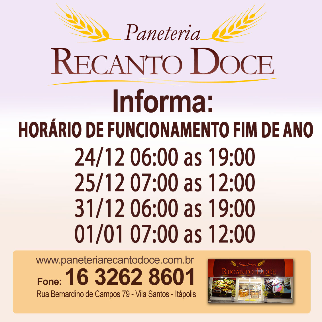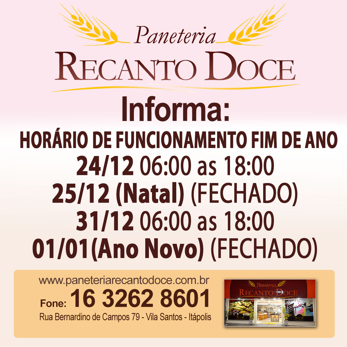 Paneteria Recanto Doce informa horário de funcionamento fim de ano