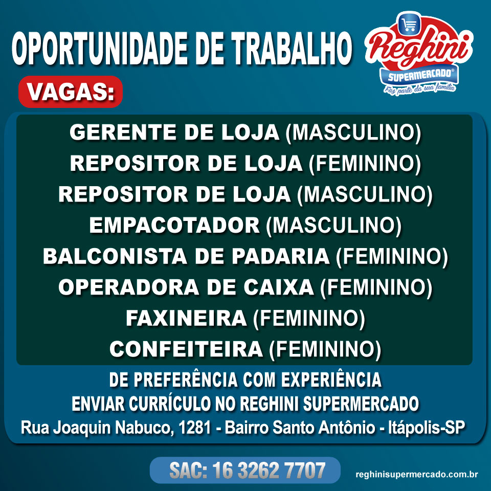 Reghini Supermercado Informa Oportunidade de Trabalho.Confira as Vagas