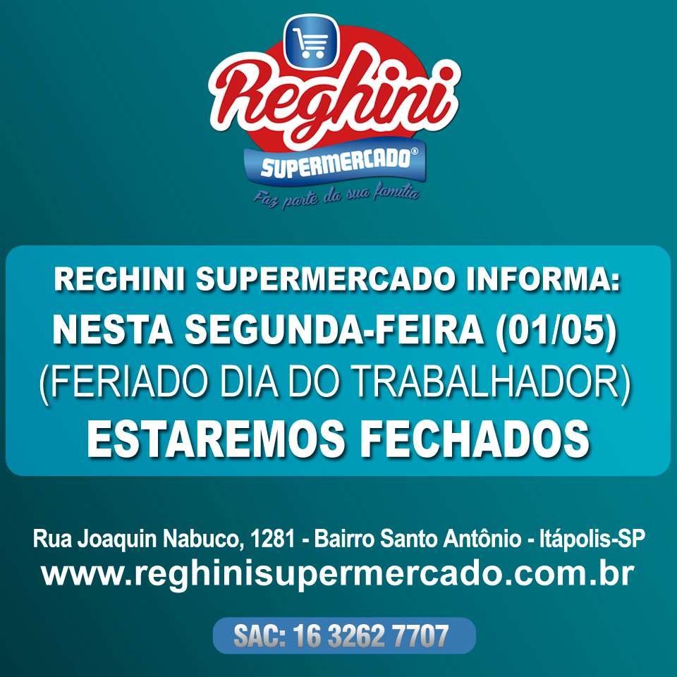 Informe Reghini Supermercado: Nesta segunda, Feriado Dia do Trabalhador, estaremos fechados.